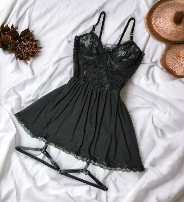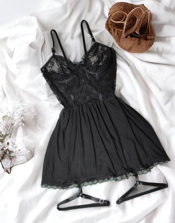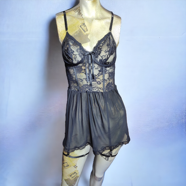 Camisolin de puntilla de encaje y microtul con arco y liguero súper sexy